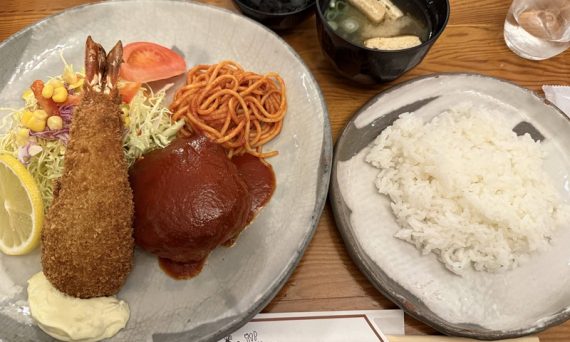 京都出張の際、以前混雑で断念した名店「グリルはせがわ」を友人と訪問。看板メニューのハンバーグとエビフライの「Aミックス」を堪能した様子を綴っています。/AIによる自動生成概要