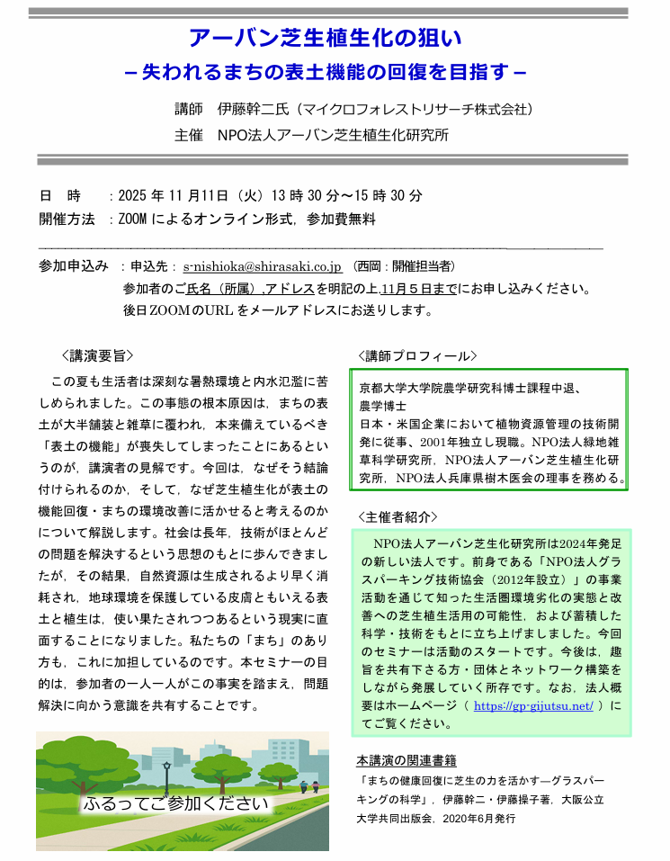NPO法人アーバン芝生植生化研究所の主催で、2025年11月11日火曜日13時半からZoomセミナーが開催されます。