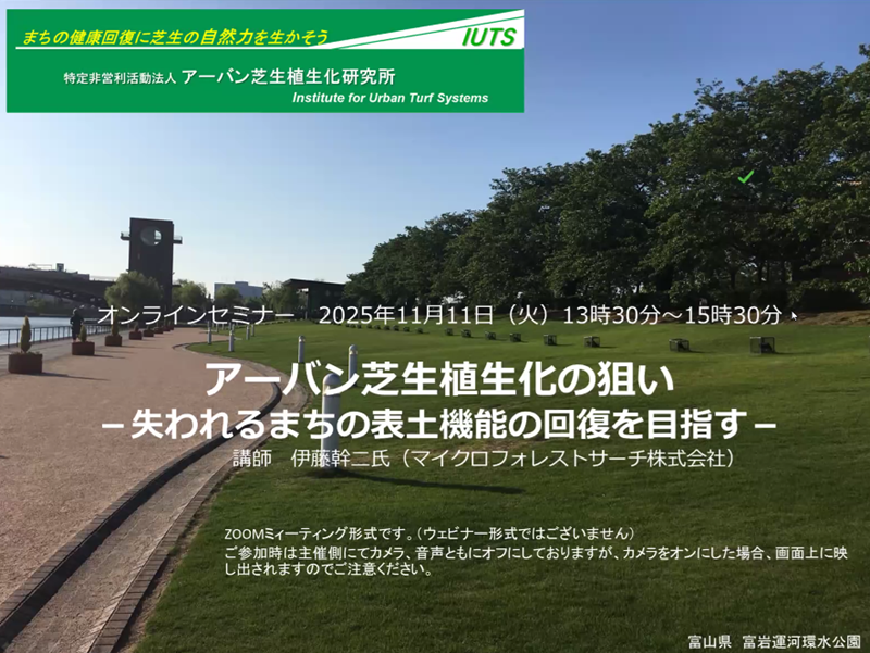 特定非営利法人アーバン芝生植生化研究所のオンラインセミナー【アーバン芝生植生化の狙い-失われるまちの表土機能の回復を目指す-】に参加した。