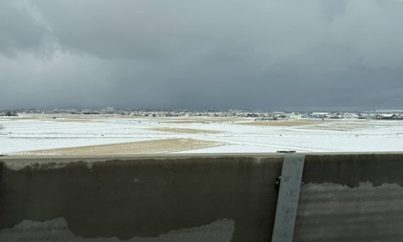 雪の北陸へ向かう車窓から、田んぼごとに異なる積雪量を観察。土づくりによる地温の差か、あるいは収穫後に伸びた「ひこばえ」の量の違いによるものかと考察しています。/AIによる自動生成概要