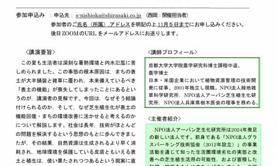 NPO法人アーバン芝生植生化研究所が、舗装によるヒートアイランド化や内水・外水氾濫などの環境リスクに対し、表土機能を回復させる最も確実で経済的な対策として「芝生植生化」をテーマに無料Zoomセミナー(11/11開催)を行う案内です。/AIによる自動生成概要