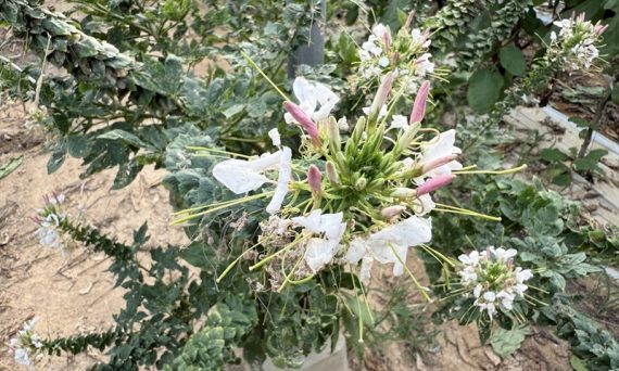 ナスのハウスでクレオメを見る