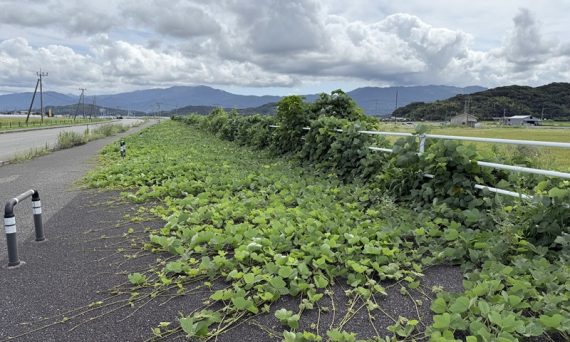 新しい道路沿いにクズが大量発生している原因を考察。造成時の盛り土に塊根が混入していたことが主な原因と指摘し、除草剤を避け安易な刈取りで管理したことが繁殖を助長したと解説しています。/AIによる自動生成概要
