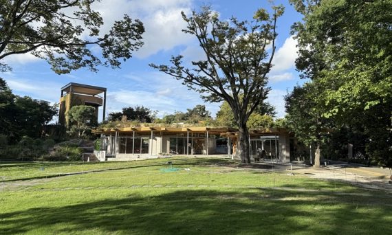 福岡市動植物園にある研修施設と芝生広場を紹介。広場に設置されたロボット草刈り機の写真を挙げ、頻繁な刈り取りによる接触ストレスで植物の成長を抑える雑草管理の秘訣を解説しています。/AIによる自動生成概要